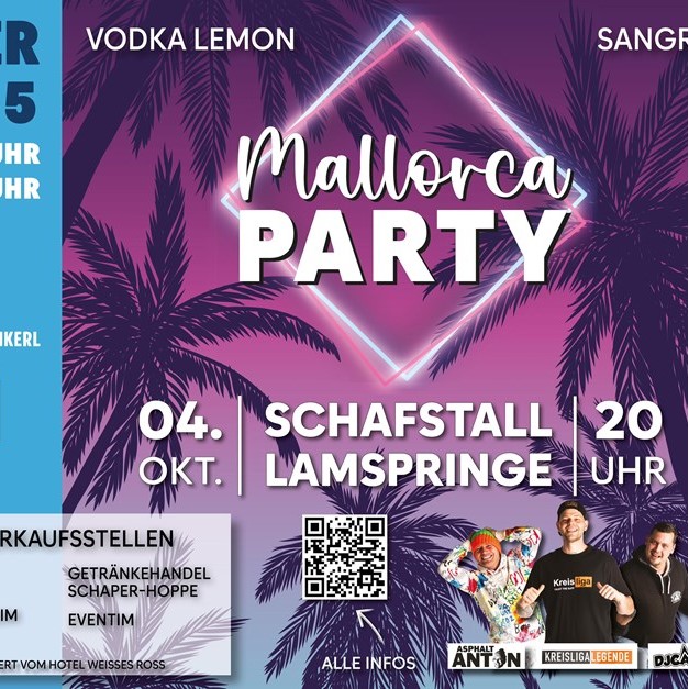 Lach, sing und tanz mit uns durch eine unvergessliche Nacht! Hol dir jetzt dein Ticket und sei dabei, wenn Lamspringe für eine Nacht nach Mallorca reist!
