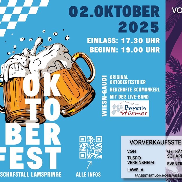 Das Oktoberfest findet am 02. Oktober 2025 im Lamspringer „Schafstall“ statt – bereits zum dritten Mal wird dort mit Lederhosen, Dirndl und gefüllten Bierkrügen gefeiert.